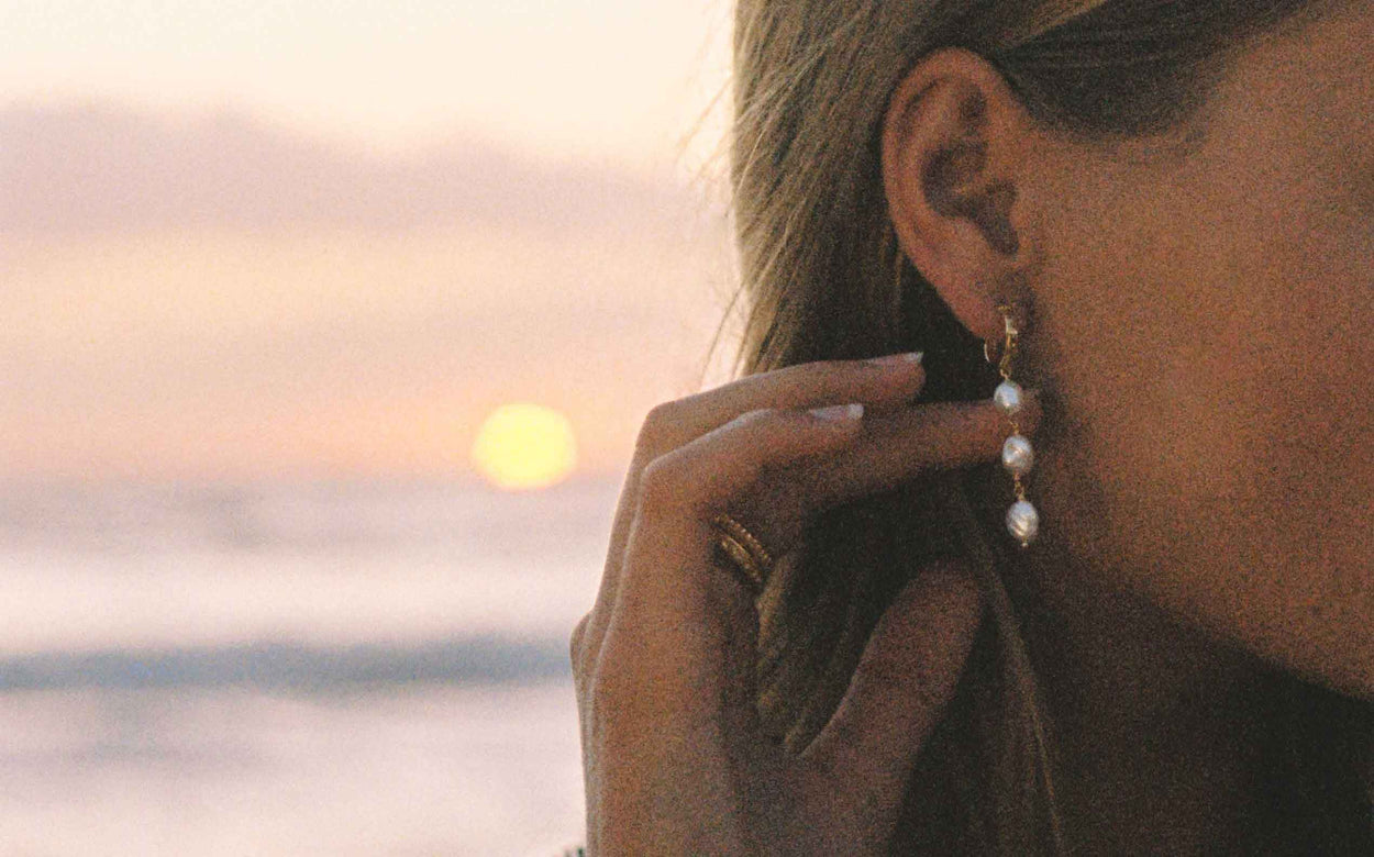 Sparkling white topaz and iridescent freshwater pearls are keystones in the Eclipse collection. These semi-precious gems reflect the beauty of the night sky studded with stars, and the Moon in all its changing phases. Stargazers will revel at the detailed craftsmanship of the Lilac Skies Coin Necklace, which features an embossed constellation of white topaz stones, while Sun chasers will appreciate the Solstice Hoops, which feature perfect Keshi Pearls to symbolise the Sun’s life-giving energy.